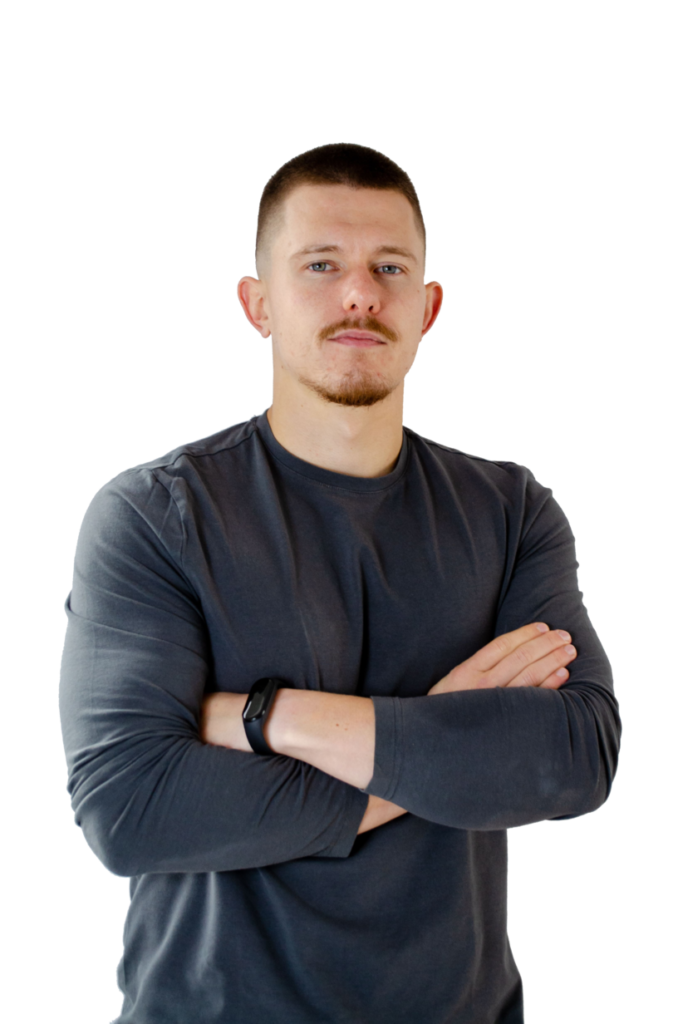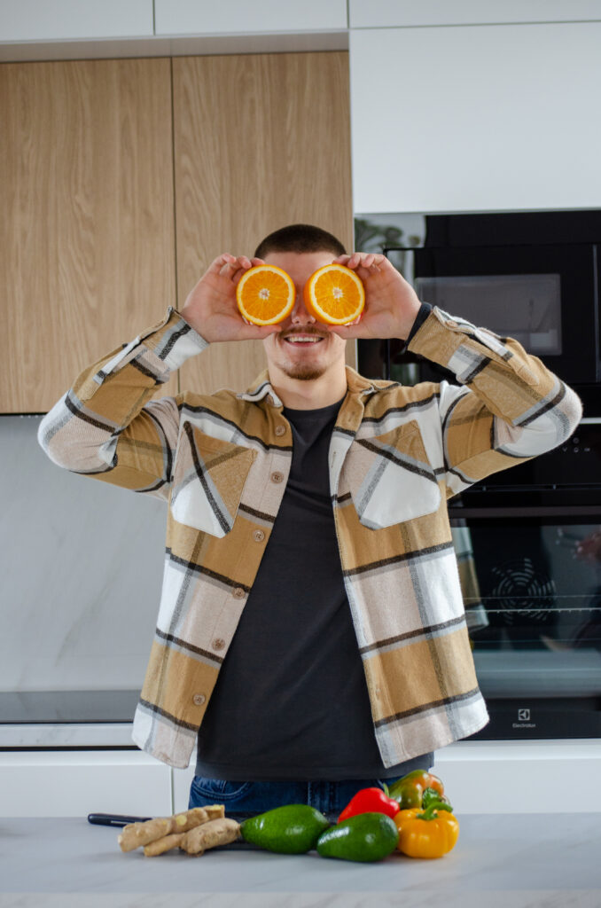 Dietetyk Oskar Radomski stoi w kuchni i trzyma w ręku laptopa.